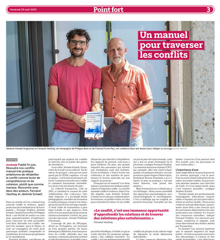 Des centaines d’heures d’écriture, de partage entre nous, de réflexion pour préciser certains termes, certaines notions, aboutissent à cette somme : un ouvrage archi-pratique – pas moins de 36 exercices pour «ancrer» les connaissances – qui fait le tour de nos connaissances, cent fois exercées au fil des formations animées par nos soins, en matière de résolution non-violente des conflits.